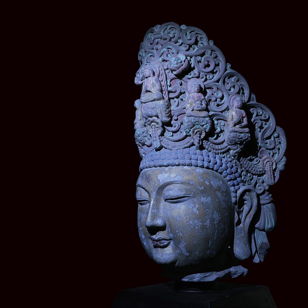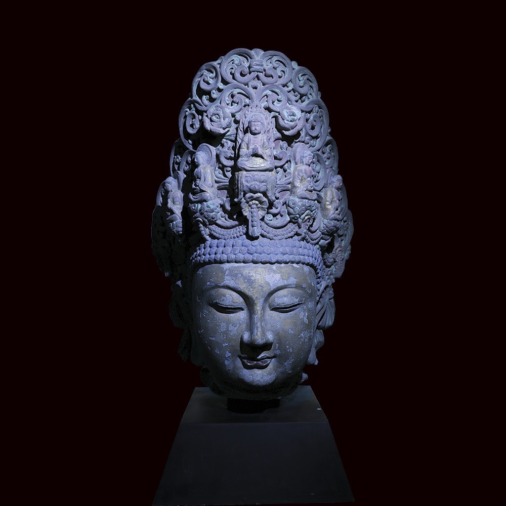 唐代的佛像头形饱满,脸颊的轮廓线有弹性,这种弹性是建立在写实性的基础上而不是北齐时期那种服务于内敛的精神实质,唐代的饱满雄强介乎于丰润与肥胖之间,一个以肥以美的朝代在对待佛像上自然不会太瘦。开脸的霸气外露是不言而喻的,眉毛高挑上扬,小嘴浅抿富有弹性,嘴巴的线条紧致饱满,双目低垂,俯瞰众生,威严不敢侧目却又带慈悲,发髻高耸,发髻里亦有佛站立,寓意膜拜顶立之意。