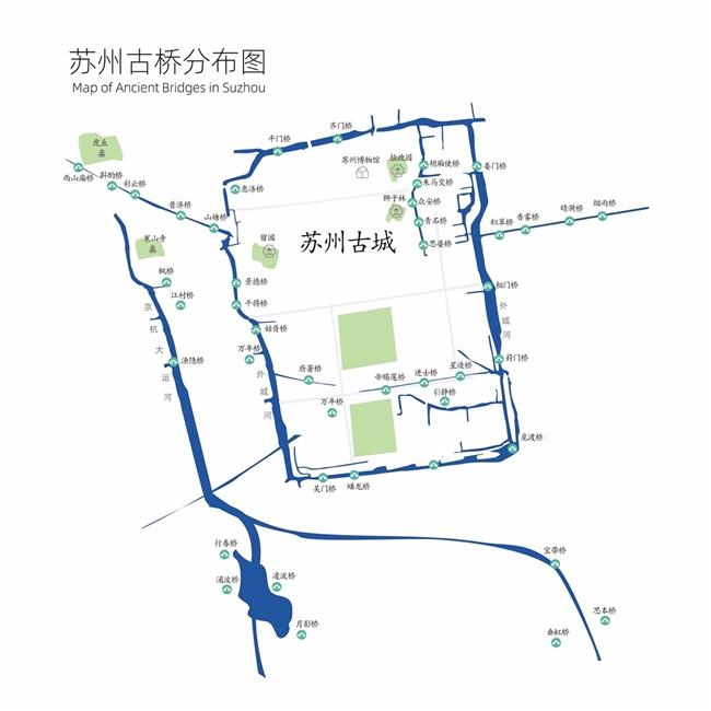 卢荻绘制了苏州古桥分布导览图,让大家能更方便地找到特色的古桥——古桥主要分布在环护城河水系以及大运河水系,针对游客常去的山塘街、平江路和十全街,专门整理了相应的访桥路线。
