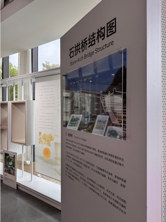 为了让大家更直观了解到苏州典型桥体——石拱桥的结构,展览者用透视图原理,在古桥照片的基础上,覆上一层亚克力将石拱桥的结构勾勒出来,直观地还原出石拱桥结构。