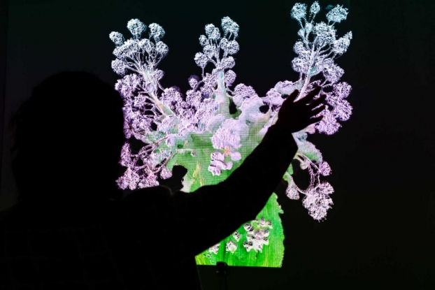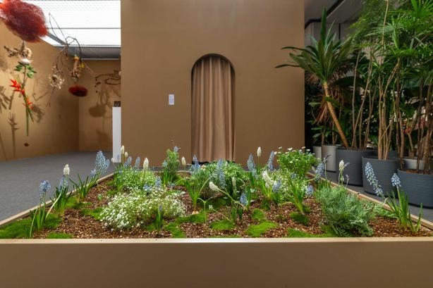 而徐睿带来的AI互动作品《春之祭》,则进一步把“生长”转化为一种可被身体直接触发的现场机制。作品内部是不断演化的数字生成系统,观众进入其中,舒展身体、缓慢移动,如同植物在春天中伸展枝叶、打开花瓣。人的动作、停留与呼吸,成为作品生成变化的条件。观众不再只是观看者,而是作品生长过程中的一部分。更具诗意的是,作品内部呈现的是数字系统中的实时生长,而作品外部的花坛则根据作品主题种植了鲜花,埋下的种子也将在展期内逐渐发芽。于是,展览在空间内外形成了两种不同维度的生长:一种是由技术驱动、实时反馈的数字生长;一种是泥土中缓慢发生、真实可见的自然生长。二者彼此映照,也共同构成了《蔓发:大地颂歌》中最具当代性的春日经验。