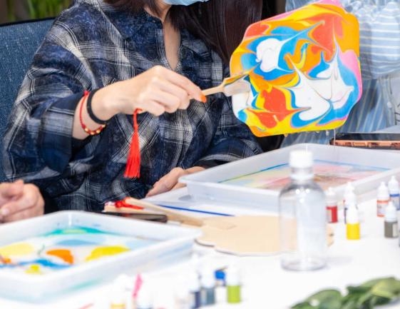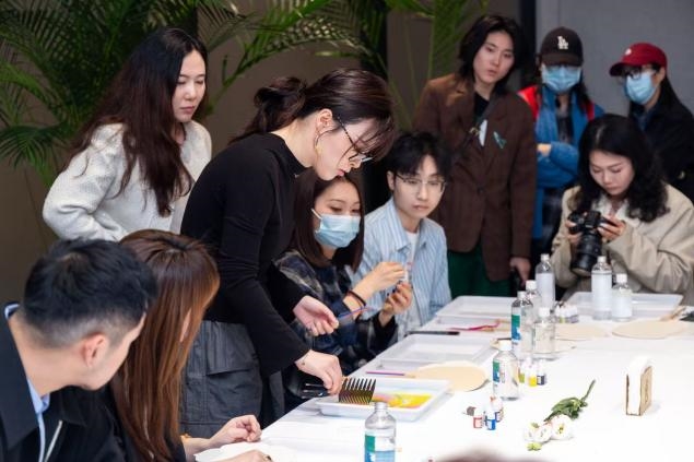 艺术家王嘉成则带来了湿拓画工作坊,让观众得以直接参与春日色彩的流动。在水面上漂浮、游走、晕开的颜色,经由每个人的介入形成不同的纹路与图像,让春天从一个抽象的季节意象,转化为手中真实可感的流动痕迹。而在王嘉成的作品中,这种流动又被赋予另一种形态:流淌着的水拥有了不同的轮廓,蓝色的、不断变化的水意,被凝固在玻璃材质里。仿佛那些原本无法停驻的事物,突然获得了一种短暂却精确的存在。正如她作品中时常流露出的静谧色调,以一种冷静、克制而细腻的语调,缓缓向观众分享着她对材料、感受与时间的理解。